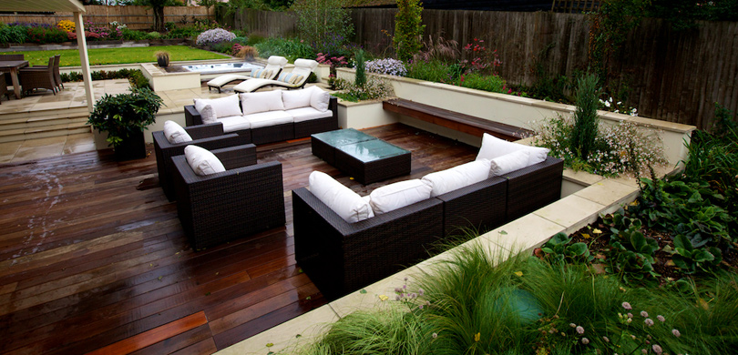A clean rectilinear geometry was used to organise the design around the living area. The sloping garden allowed the use of retaining walls and long elegant steps to divide up the areas. A raised area for dining and a lower area for relaxing were created. A built in seat was included in the sofa area to allow for extra seats but doubled as structural feature all year round. The hot tub was semi recessed into the raised area allowing people to sit in the hot tub and still talk to others in the sofa area. The planting was based on soft perennials and grasses to help blend into the countryside setting.