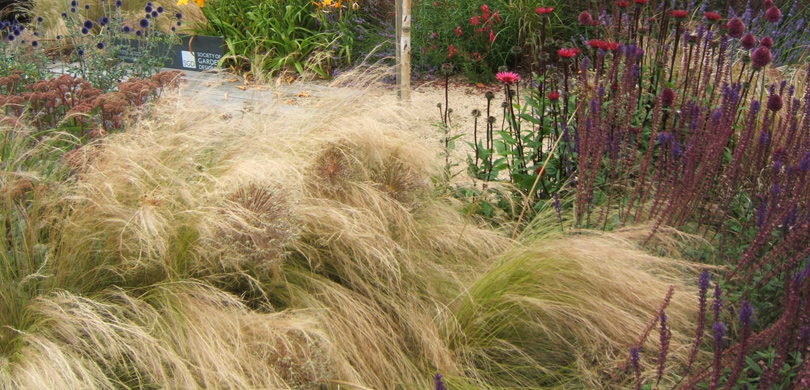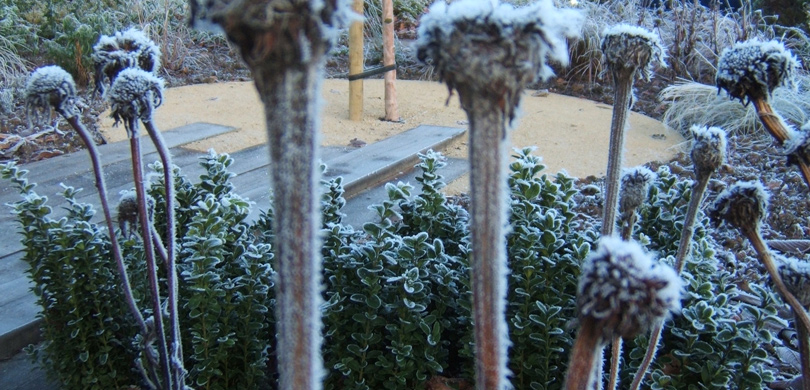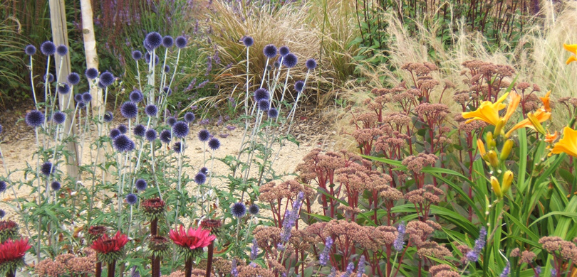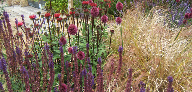 This design is based on a strong geometric framework using the sleepers, the circle and the two long rectangles of box. This is interplanted with drifts of my favourite perennials and grasses. The result is a front garden that continually gives interest no matter the time of year and constantly draws admiring glances and comments. This is despite some of the neighbours’ initial bemused looks as I pulled up the lawn. Not only does it look great, but I also spend far less time looking after this than I would if it had still been lawn and I'd had to mow, weed, feed etc. and the butterflies and bees love it. There are literally hundreds of bees in the garden throughout the summer.