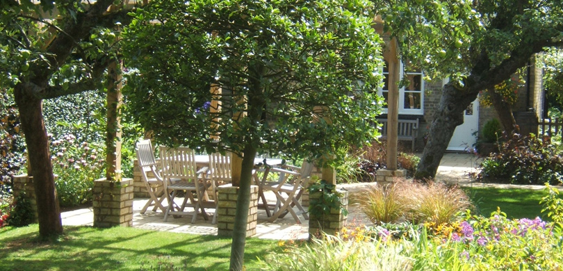 A new layout fundamentally shaped by new large borders was created. A new seating area in complete sympathy with the house was designed, utilising bricks left over from some renovation work. Although the mature trees all stayed in place, the new structure gave them all a reason for their position rather than just appearing randomly placed as previously.